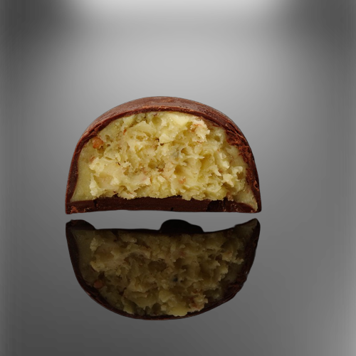 Состав: Корпус: темный шоколад. Начинка: шоколад молочный, шоколад темный, марципан (миндаль), сироп лимона, макадамия, Лимончелло (ликер), розовая гималайская соль