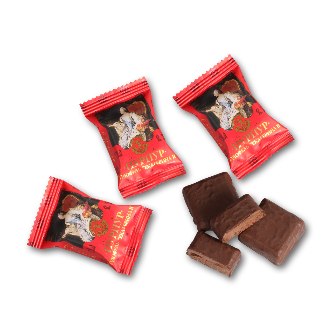 Екатерина II - Молочный трюфель с малиной в темном шоколаде. Позвольте соблазнить Вас ароматным трюфелем, облитым натуральным темным шоколадом Barry Callebaut. Закройте глаза и почувствуйте, как в сердцевине молочного шоколада кокетничают малиновые нотки. Ярчайший, страстный вкус, как блеск одной из самых ярких императриц России. Вес 1000 г. Состав: Шоколад тёмный (какао тертое, сахар, какао - масло, эмульгатор (подсолнечный лецитин), ваниль натуральная), шоколад молочный (сахар, какао - масло, сухое молоко, какао тертое, эмульгатор (подсолнечный лецитин), кранч малины сушеный, концентрированный сок малины, сахар, фруктозный сироп, рисовая мука, желеобразователь (пектин), лимонная кислота, масло сливочное, масло какао, ваниль натуральная.