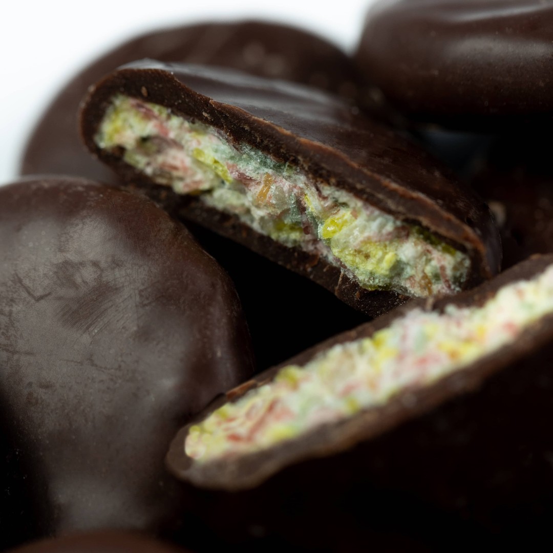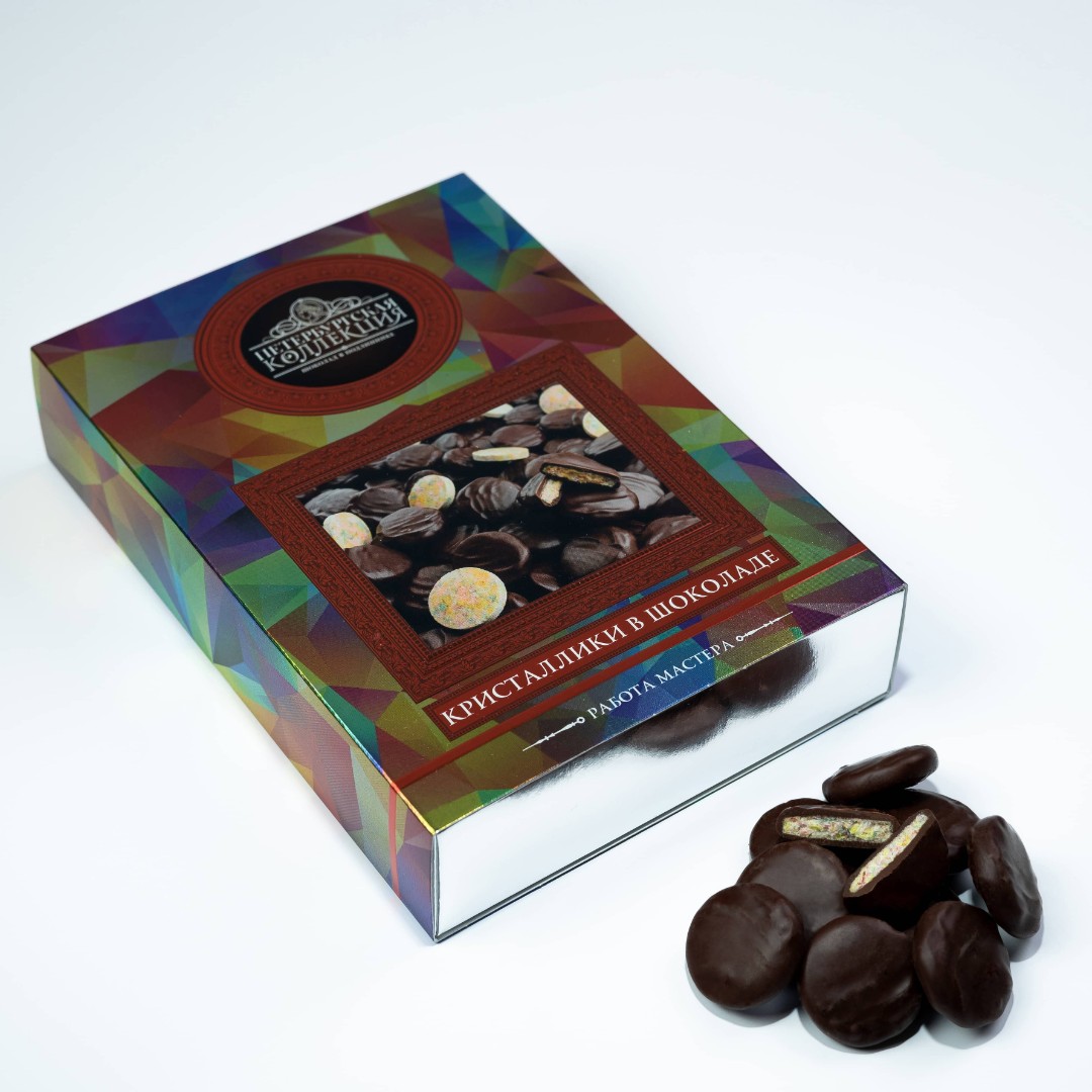 Кристаллики в шоколаде - дробленная карамельная крошка покрытая слоем тёмного шоколада. Вкусное лакомство для детей и взрослых. Состав: сахар, патока, регулятор кислотности – лимонная кислота, натуральные ароматизаторы: вишня, яблоко, апельсин, лимон; натуральные пищевые красители: кармин, паприка, турмерик, хлорофилл; тёмный шоколад (какао тёртое, какао масло, сахар, эмульгатор – лецитин, ваниль). Содержание какао продуктов не менее 55%. Противопоказано при индивидуальной непереносимости лецитина. Продукт может содержать следы: арахиса, орехов, глютена, молочного белка. Хранить при температуре 18±3ºС и относительной влажности воздуха не более 75%. Беречь от тепла! Система менеджмента безопасности пищевых продуктов фабрики сертифицирована и соответствует требованиям международного стандарта ISO 22000-2019 (HACCP). Артикул: 166 Вес (гр.): 260 Углеводы: 63.8 Жиры: 13.6 Протеин: 2.2 Ккал: 411 Срок год.: 6 мес.