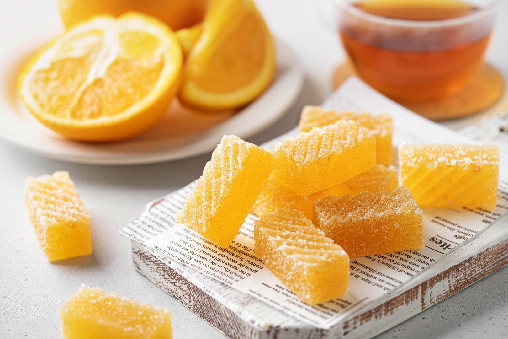 Мармелад на основе натуральных апельсинов с ярким цитрусовым вкусом и ароматом. Изготовлен из спелых и сочных апельсинов, отобранных вручную для идеального баланса сладости и легкой цитрусовой кислинки. Бережный процесс приготовления позволяет максимально сохранить полезные свойства мармелада, делая его не только вкусным, но и полезным лакомством. Состав: сахар, апельсины, патока, желирующий агент - пектин, регуляторы кислотности: лимонная кислота, цитрат натрия. Хранить при температуре 18±3ºС и относительной влажности воздуха не более 75%. Система менеджмента безопасности пищевых продуктов фабрики сертифицирована и соответствует требованиям международного стандарта ISO 22000-2019 (HACCP). Вес (гр.): 100 Углеводы: 74.3 Жиры: 0.1 Протеин: 0.2 Ккал: 287 Срок год.: 6 мес.
