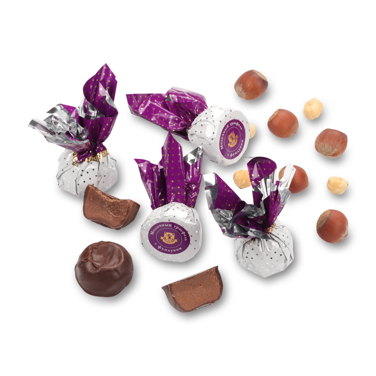 Молочный трюфель с фундуком. Вес 1000 г. Состав: Шоколад темный: (какао тертое, сахар, какао-масло, эмульгатор (подсолнечный лецитин), ваниль натуральная), шоколад молочный (сахар, масло какао, сухое молоко, какао тертое ,эмульгатор (подсолнечный лецитин) ,ядро ореха фундука тертое, сливочное масло, Армянский коньяк, сухое цельное молоко, экстракт мадагаскарской ванили.