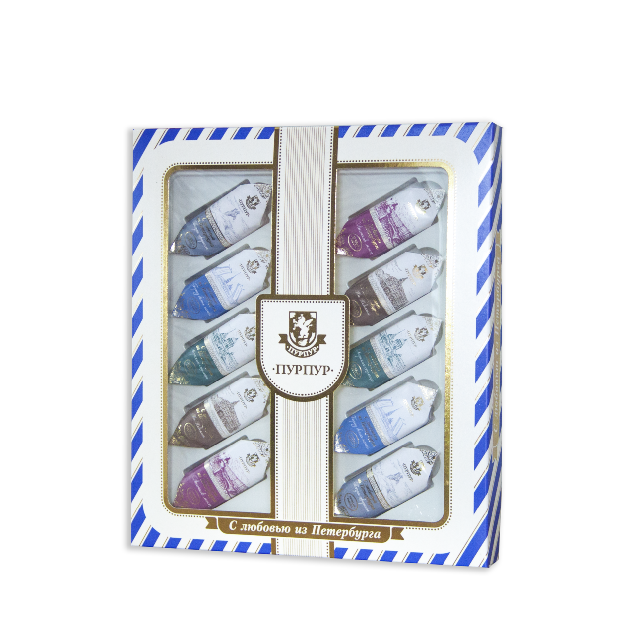 Набор шоколадных конфет "С Любовью из Петербурга". Вес 130 г. Содержит1) Петра Творенье - марципановая помадка в тёмном шоколаде 2) Морская столица - фундучно-арахисовая халва с трюфельным кремом в тёмном шоколаде 3) Город Белых Ночей - трюфель с черничным ликёром в тёмном шоколаде 4) На Невском - молочно-кофейный трюфель в темном шоколаде 5) Аничков мост - молочно-ореховое пралине в темном шоколаде