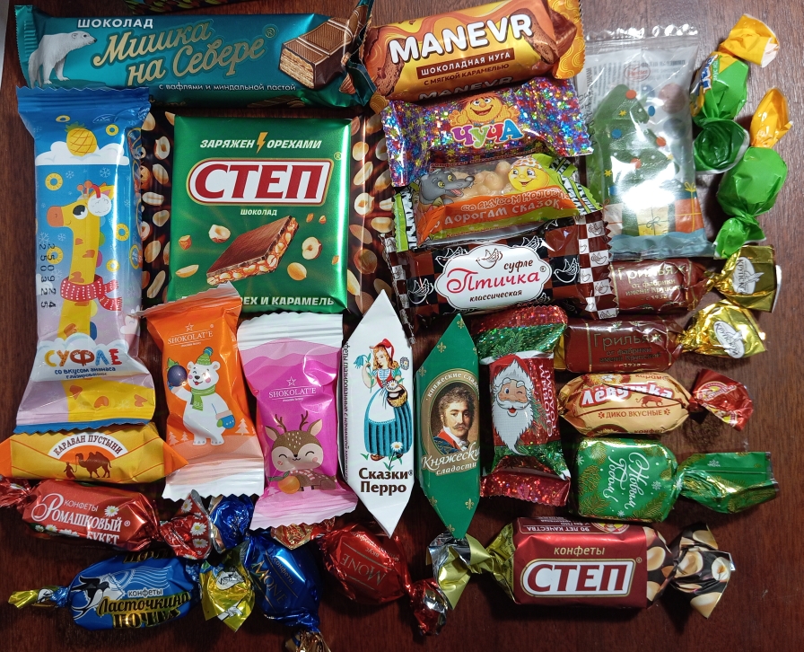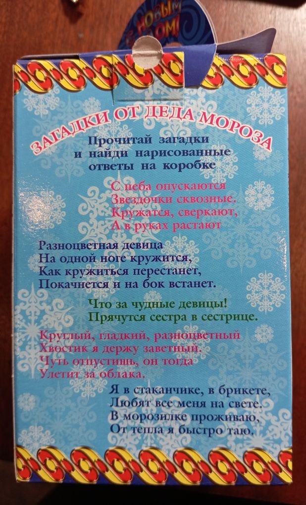 Подарок № 17 Загадки Деда Мороза. вес 470грамм. Состав подарка: Ш-д молочный 50гр-1шт. Батончик Мишка на севере вафельный 40гр-1шт. Ёлочка формовая мармелад Нева 22гр-1шт. Нуга и мягкая карамель глазированная 34гр-1шт. Суфле глазированное НГ Нева 37гр-1шт. К-та Степ-1шт. К-ты молочные-2шт. К-ты Зверята шоколадный микс-2шт. К-ты Грильяжные крокант глазированный-4шт. К-та Палочки шоколадные-2шт. К-та Караван пустыни-1шт. К-та Новогодняя двслойная-1шт. К-та Сказки Перро вафельная-1шт. К-та Помадные-2шт. К-та Лёвушка нуга мягкая карамель-1шт. К-ты жевательный мармелад-2шт. К-ты Моне ассорти-2шт. * Возможна замена кондитерских изделий на аналогичные по вкусу и стоимости. +7(911)-951-26-16