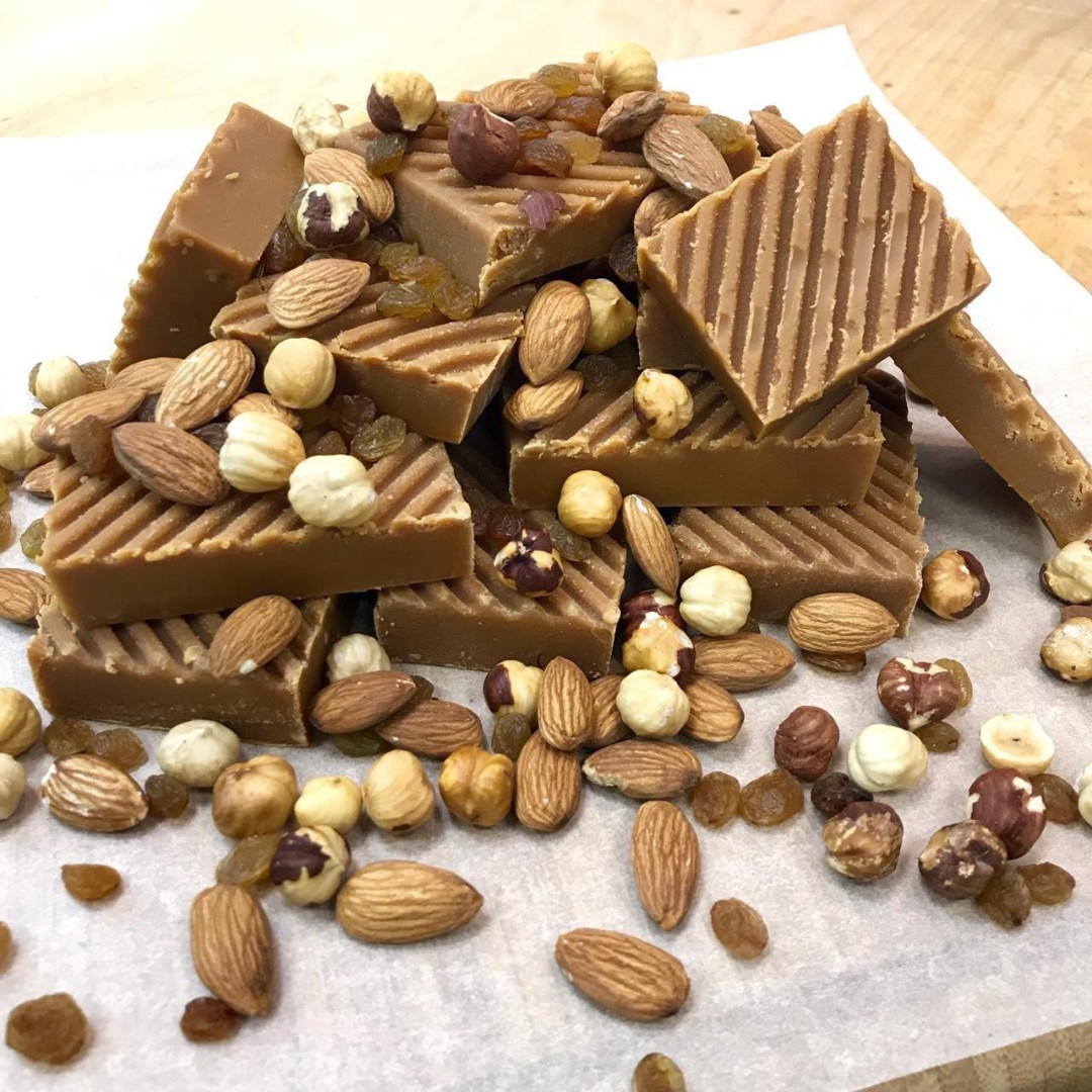 сахар, натуральное сгущенное молоко, патока, натуральное сливочное масло 82,0%, миндаль жаренный, ваниль натуральная. Артикул: 112 Вес (гр.): 100 Углеводы: 82.6 Жиры: 8 Протеин: 2.9 Ккал: 400