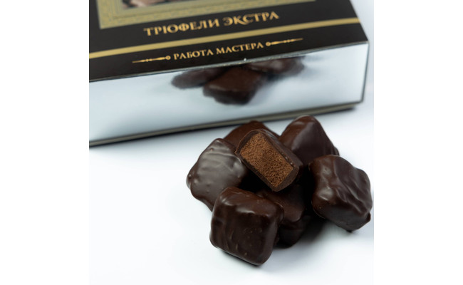 Фирменные трюфели экстра из насыщенного настоящего темного шоколада – одно из самых любимых угощений наших покупателей. Потрясающий аромат какао-бобов и молотого кофе, терпкий вкус коньяка, а также красивая элегантная упаковка. Состав: какао тёртое, сахар, сливочное масло 82%, какао масло, коньяк 5 звёзд, сгущённое молоко (цельное молоко, сахар), кофе молотый, ваниль; тёмный шоколад (какао тёртое, какао масло, сахар, эмульгатор – лецитин, ваниль)