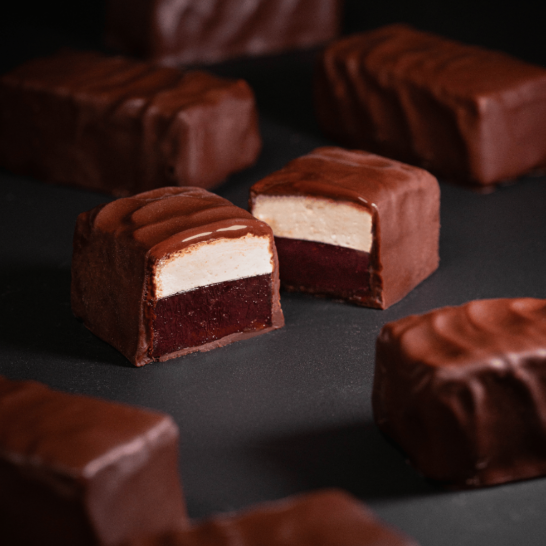 Насладитесь нежным желе-суфле с ярким клубничным вкусом. Тёмный шоколад придает этим конфетам насыщенный вкус и приятное послевкусие, которое дополняет клубничную начинку. Удобная упаковка для приятных моментов в любом месте. Состав: сахар, клубника, патока, желирующие агенты: пектин, агар; белок яичный сухой, ваниль, регуляторы кислотности: лимонная кислота, цитрат натрия; тёмный шоколад (какао тёртое, какао масло, сахар, эмульгатор - лецитин, ваниль). Содержание какао продуктов не менее 55%. Противопоказано при индивидуальной непереносимости: молочного белка, лецитина. Продукт может содержать следы: арахиса, орехов, глютена. Хранить при температуре 18±3ºС и относительной влажности воздуха не более 75%. Беречь от тепла! Система менеджмента безопасности пищевых продуктов фабрики сертифицирована и соответствует требованиям международного стандарта ISO 22000-2019 (HACCP). Вес (гр.): 145 Углеводы: 68.4 Жиры: 7.5 Протеин: 1.6 Ккал: 355 Срок год.: 6 мес.