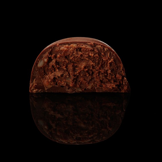 Корпус: темный шоколад. Начинка: горький шоколад, молочный шоколад, белый шоколад, миндаль тертый, цукаты мандарина, ваниль.